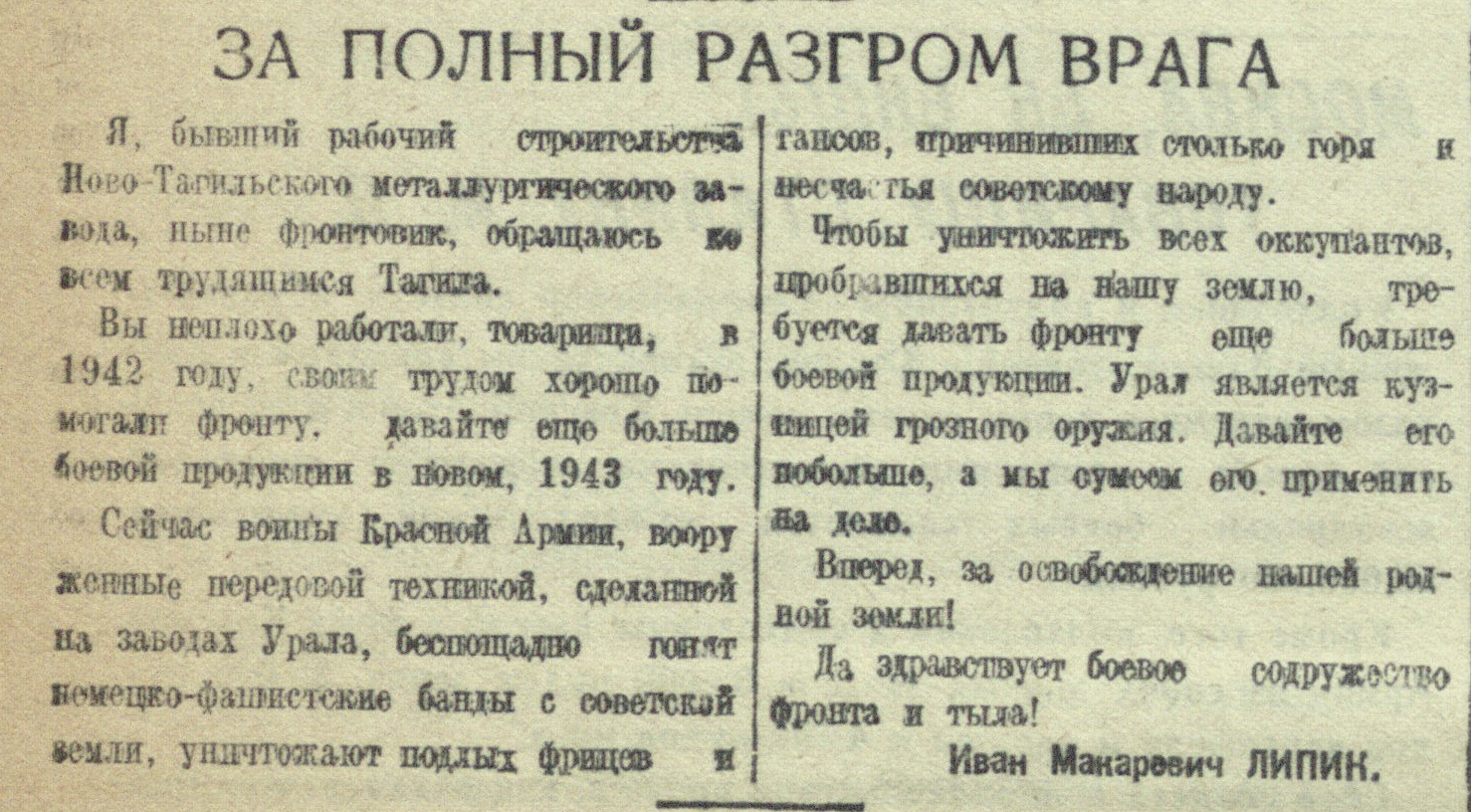 Я, бывший рабочий строительства Ново-Тагильского металлургического завода, ныне фронтовик, обращаюсь ко всем трудящимся Тагила.