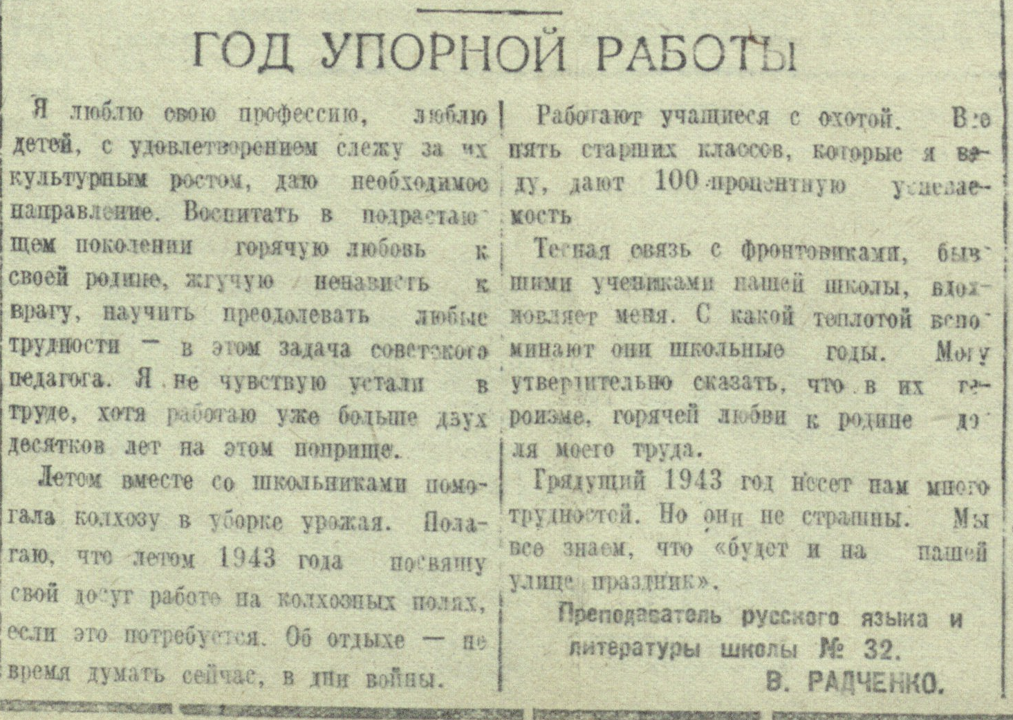 Летом вместе со школьниками помогала колхозу в уборке урожая. Полагаю, что летом 1943 года посвящу свой досуг работе на колхозных полях, если это потребуется. Об отдыхе – не время думать сейчас, в дни войны.