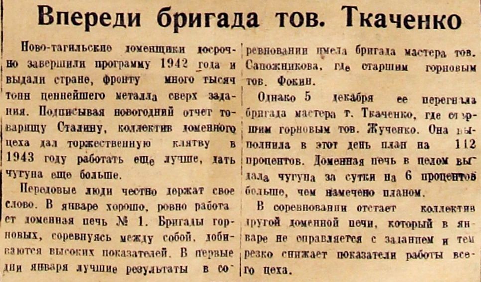 Ново-тагильские доменщики досрочно завершили программу 1942 года и выдали стране, фронту много тысяч тонн ценнейшего металла сверх задания. Подписывая новогодний отчет товарищу Сталину, коллектив доменного цеха дал торжественную клятву в 1943 году работать еще лучше, дать чугуна еще больше.
