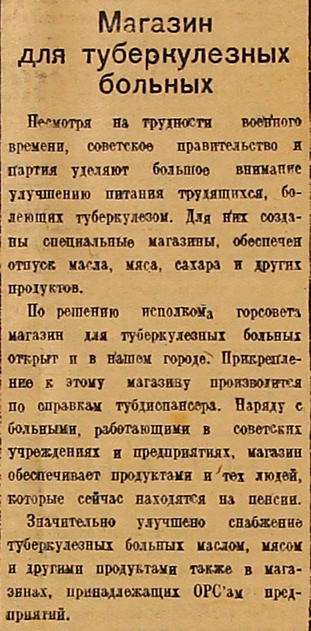 Несмотря на трудности военного времени, советское правительство и партия уделяют большое внимание улучшению питания трудящихся, болеющих туберкулезом. Для них созданы специальные магазины, обеспечен отпуск масла, мяса, сахара и других продуктов.