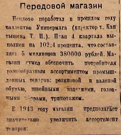 Неплохо поработал в прошлом году коллектив Универмага (директор т. Кантышева Т. П.). План 4 квартала выполнен на 102,4 процента, что составляет 5 миллионов 380000 рублей. Магазин сумел обеспечить потребителя разнообразным ассортиментом промышленных товаров: резиновой и валеной обувью, швейными изделиями, головными уборами, трикотажем.
