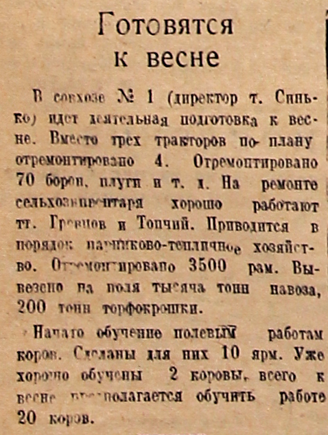 В совхозе № 1 (директор т. Синько) идет деятельная подготовка к весне. Вместо трех тракторов по плану отремонтировано 4. Отремонтировано 70 борон, плуги и т. д. На ремонте сельхозинвентаря хорошо работают тт. Гривцов и Топчий. Приводится в порядок парниково-тепличное хозяйство. Отремонтировано 3500 рам. Вывезено на поля тысяча тонн навоза, 200 тонн торфокрошки.