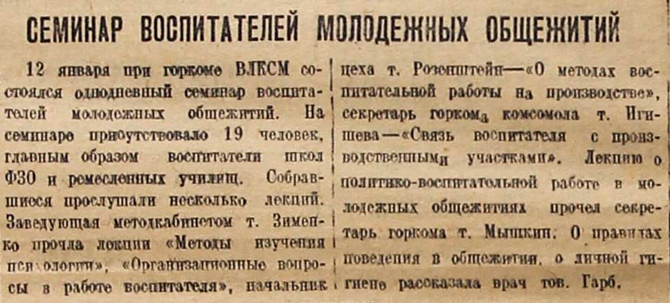 12 января при горкоме ВЛКСМ состоялся однодневный семинар воспитателей молодежных общежитий. Нa семинаре присутствовало 19 человек, главным образом воспитатели школ ФЗО и ремесленных училищ. Собравшиеся прослушали несколько лекций. Заведующая методкабинетом т. Зименко прочла лекции «Методы изучения психологии», «Организационные вопросы в работе воспитателя», начальник цеха т. Розенштейн – «О методах воспитательной работы на производстве», секретарь горкома комсомола т. Игишева – «Связь воспитателя с производственными участками». Лекцию о политико-воспитательной работе в молодежных общежитиях прочел секретарь горкома т. Мышкин. О правилах поведения в общежитии, о личной гигиене рассказала врач тов. Гарб.