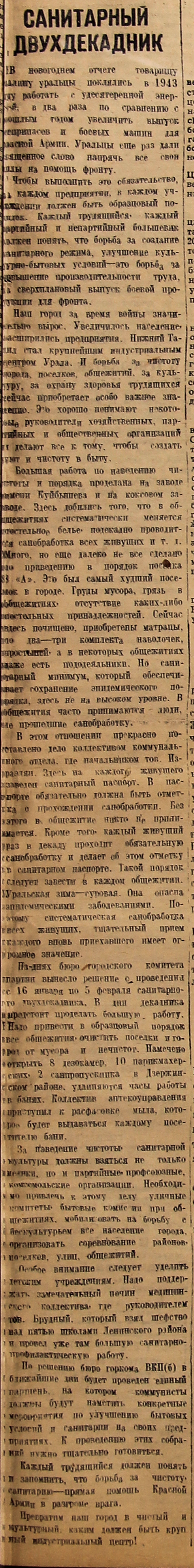 Наш город за время войны значительно вырос. Увеличилось население, расширились предприятия. Нижний Тагил стал крупнейшим индустриальным центром Урала. И борьба за чистоту города, поселков, общежитий, за культуру, за охрану здоровья трудящихся сейчас приобретает особо важное значение. Это хорошо понимают некоторые руководители хозяйственных, партийных и общественных организаций. Они делают все к тому, чтобы создать уют и чистоту в быту.