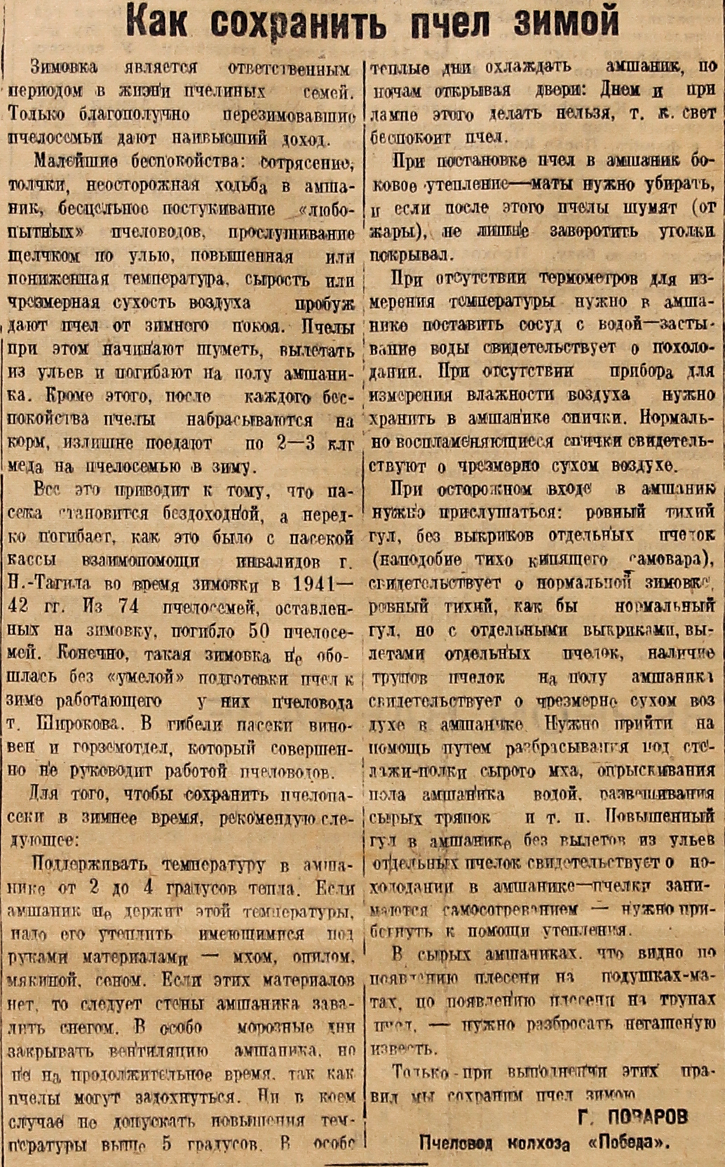Все это приводит к тому, что пасека становится бездоходной, а нередко погибает, как это было с пасекой кассы взаимопомощи инвалидов г. Н.-Тагила во время зимовки в 1941-42 гг. Из 74 пчелосемей, оставленных на зимовку, погибло 50 пчелосемей. Конечно, такая зимовка обошлась без «умелой» подготовки пчел к зиме работающего у них пчеловода т. Широкова. В гибели пасеки виновен и горземотдел, который совершенно не руководит работой пчеловодов.