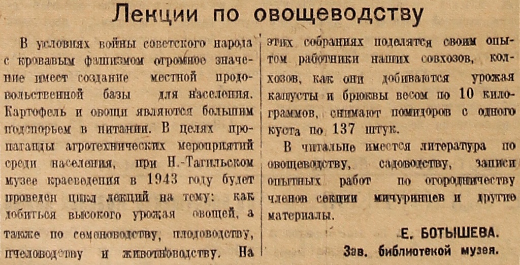 В условиях войны советского народа с кровавым фашизмом огромное значение имеет создание местной продовольственной базы для населения. Картофель и овощи являются большим подспорьем в питании. В целях пропаганды агротехнических мероприятий среди населения, при Н.-Тагильском музее краеведения в 1943 году будет проведен цикл лекций на тему: как добиться высокого урожая овощей, а также по семеневодству, плодоводству, пчеловодству и животноводству. На этих собраниях поделятся своим опытом работники наших совхозов, колхозов, как они добиваются урожая капусты и брюквы весом по 10 килограммов, снимают помидоров с одного куста по 137 штук.