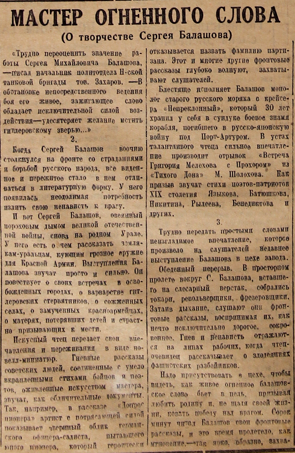 «Трудно переоценить значение работы Сергея Михайловича Балашова, – писал начальник политотдела Н-ской танковой бригады тов. Захаров. – В обстановке непосредственного ведения боя его живое, зажигающее слово обладает исключительной силой воздействия – удесятеряет желание мстить гитлеровскому зверью...»