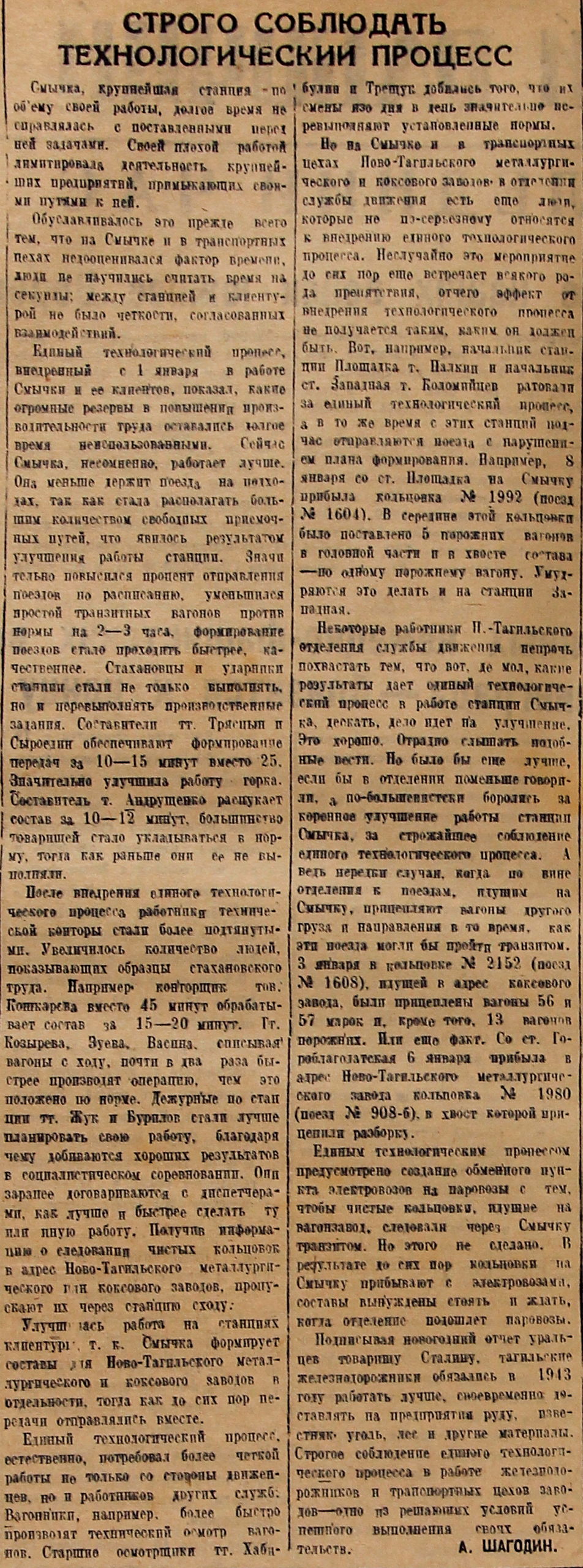 После внедрения единого технологического процесса работники технической конторы стали более подтянутыми. Увеличилось количество людей, показывающих образцы стахановского труда. Например конторщик тов. Кошкарова вместо 45 минут обрабатывает состав за 15-20 минут. Тт. Козырева, Зуева, Васина, списывая вагоны с ходу, почти в два раза быстрее производят операцию, чем это положено по норме. Дежурные по станции Жук и Бурилов стали лучше планировать свою работу, благодаря чему добиваются хороших результатов в социалистическом соревновании. Они заранее договариваются с диспетчерами как лучше и быстрее сделать ту или иную работу. Получив информацию о следовании чистых кольцовок в адрес Ново-Тагильского металлургического или коксового заводов, пропускают их через станцию сходу. Улучшилась работа на станциях клиентуры, т. к. Смычка формирует составы для Ново-Тагильского металлургического и коксового заводов в отдельности, тогда как до сих пор передачи отправлялись вместе.