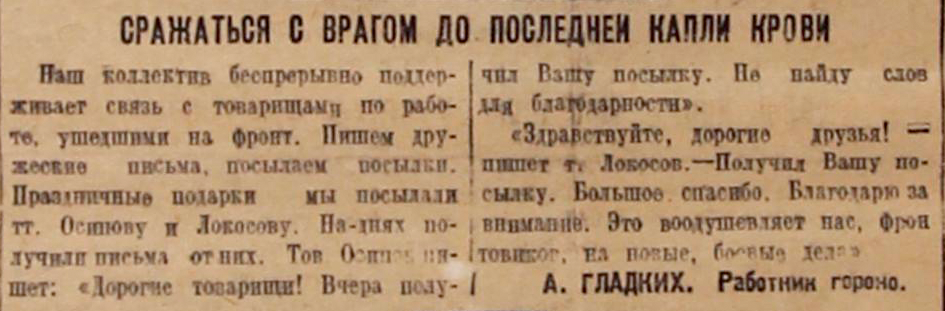 Наш коллектив беспрерывно поддерживает связь с товарищами по работе, ушедшими на фронт. Пишем дружеские письма, посылаем посылки. Праздничные подарки мы посылали тт. Осипову и Локосову. На-днях получили письма от них. Тов. Осипов пишет: «Дорогие товарищи! Вчера получил вашу посылку. Не найду слов для благодарности».