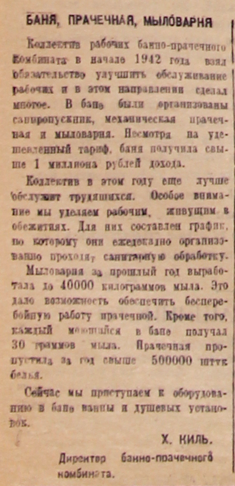 Коллектив рабочих банно-прачечного комбината в начале 1942 года взял обязательство улучшить обслуживание рабочих и в этом направлении сделал много. В бане были организованы санпропускник, механическая прачечная и мыловарня. Несмотря на удешевленный тариф, баня получила свыше 1 миллиона рублей дохода.