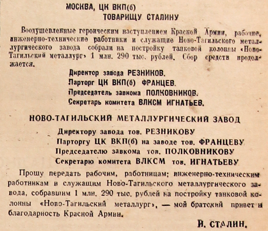 Прошу передать рабочим, работницам, инженерно-техническим работникам и служащим Ново-Тагильского металлургического завода, собравшим 1 млн. 290 тыс. рублен на постройку танковой колонны «Ново-Тагильский металлург», – мой братский привет и благодарность Красной Армии.