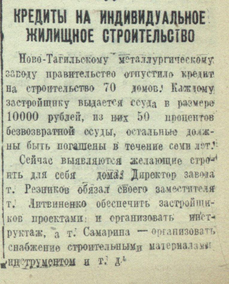 Кредиты на индивидуальное жилищное строительство Ново-Тагильскому металлургическому заводу правительство отпустило кредит на строительство 70 домов. Каждому застройщику выдается ссуда в размере 10000 рублей, из них 50 процентов безвозвратной ссуды, остальные должны быть погашены в течение семи лет.