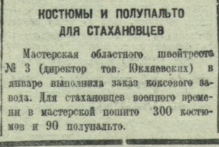 Мастерская областного швейтреста № 3 (директор тов. Юкляевских) в январе выполнила заказ коксового завода. Для стахановцев военного времени в мастерской пошито 300 костюмов и 90 полупальто.