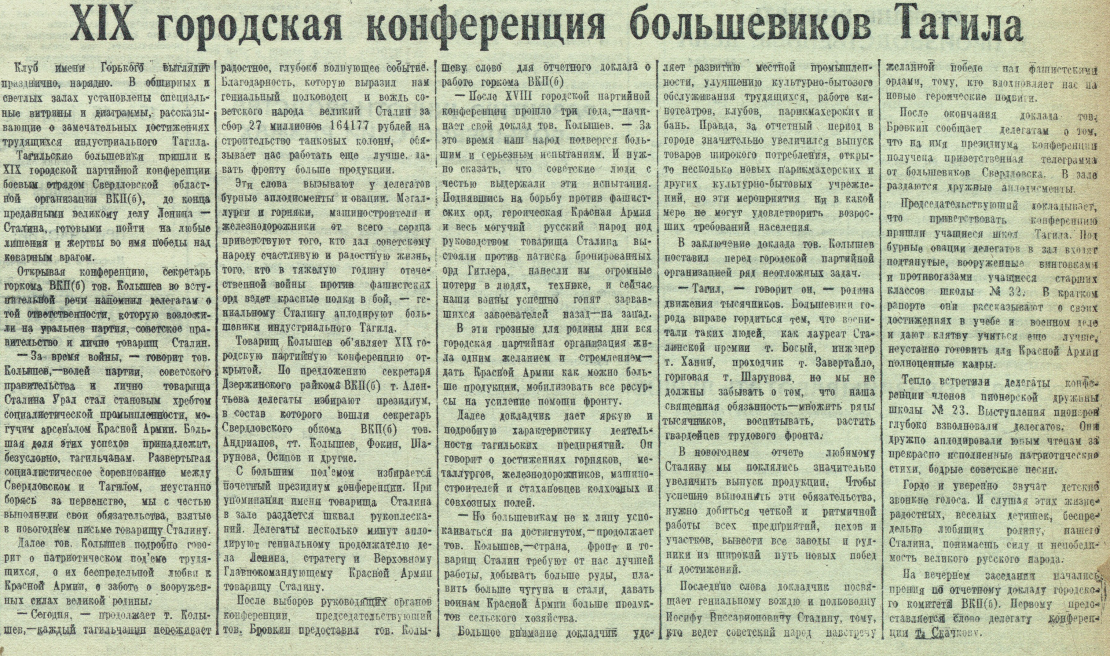 Эти слова вызывают у делегатов бурные аплодисменты и овации. Металлурги и горняки, машиностроители и железнодорожники от всего сердца приветствуют того, кто дал советскому народу счастливую и радостную жизнь, того, кто в тяжелую годину отечественной войны против фашистских орд ведет красные полки в бой, — гениальному Сталину аплодируют большевики индустриального Тагила.