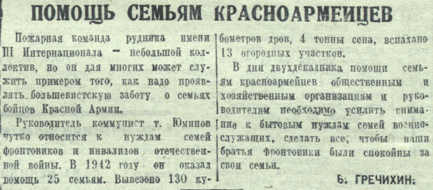 Руководитель коммунист т. Юминов чутко относится к нуждам семей фронтовиков и инвалидов отечественной войны. В 1942 годy он оказал помощь 25 семьям. Вывезено 130 кубометров дров, 4 тонны сена, вспахано 13 огородных участков.