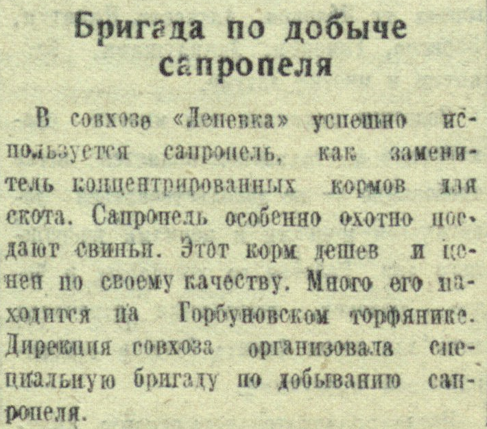 В совхозе «Леневка» успешно используется сапропель, как заменитель концентрированных кормов для скота. Сапропель особенно охотно поедают свиньи. Этот корм дешев и ценен по своему качеству. Много его находится на Горбуновском торфянике. Дирекция совхоза организовала специальную бригаду по добыванию сапропеля.