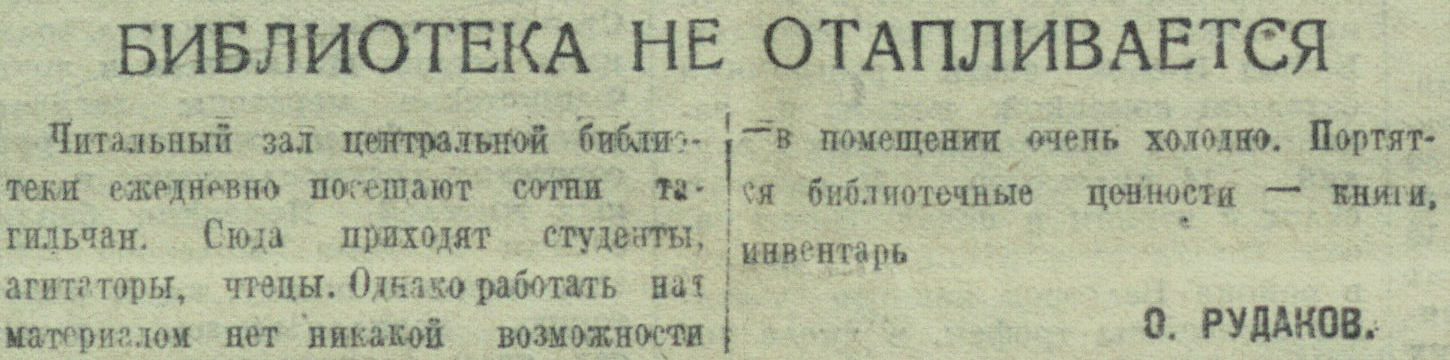Читальный зал центральной библиотеки ежедневно посещают сотни тагильчан. Сюда приходят студенты, агитаторы, чтецы. Однако работать над материалом нет никакой возможности — в помещении очень холодно. Портятся библиотечные ценности — книги, инвентарь.