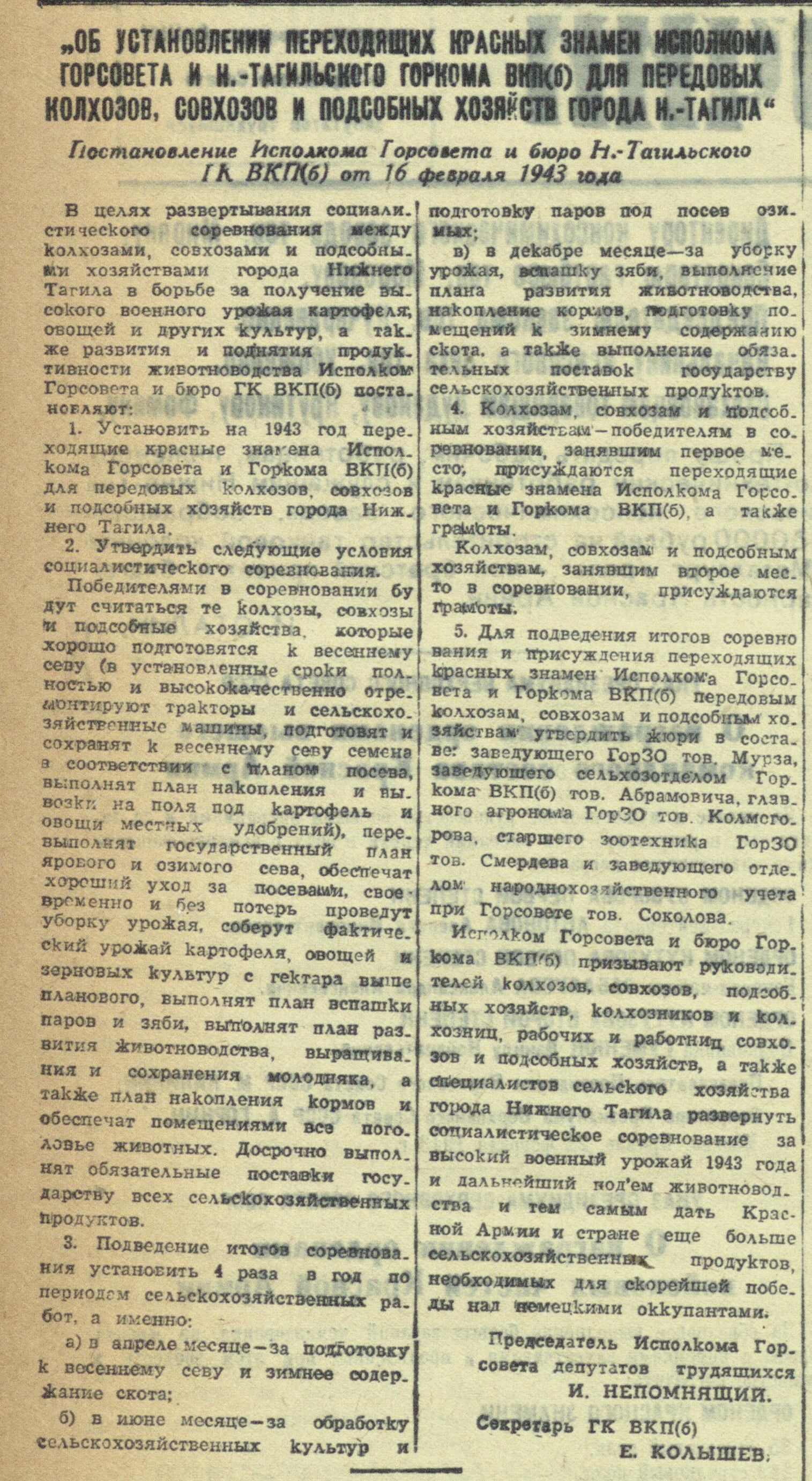 Исполком Горсовета и бюро Горкома ВКП(б) призывают руководителей колхозов, совхозов, подсобных хозяйств, колхозников и колхозниц, рабочих и работниц совхозов и подсобных хозяйств, а также специалистов сельского хозяйства города Нижнего Тагила развернуть социалистическое соревнование за высокий военный урожай 1943 года и дальнейший подъем животноводства и тем самым дать Красной Армии и стране еще больше сельскохозяйственных продуктов, необходимых для скорейшей победы над немецкими оккупантами.