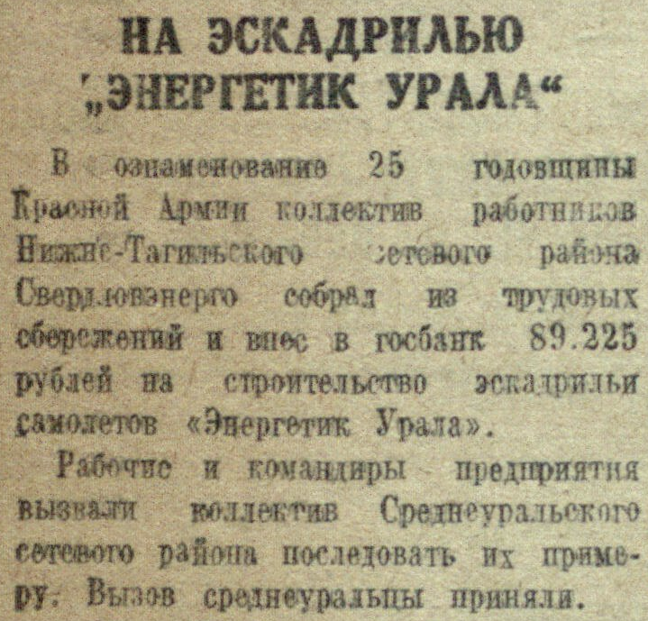 В ознаменование 25 годовщины Красной Армии коллектив работников Нижне-Тагильского сетевого paйона Свердловэнерго собрал из трудовых сбережений и внес в госбанк 89.225 рублей на строительство эскадрильи самолетов «Энергетик Урала».