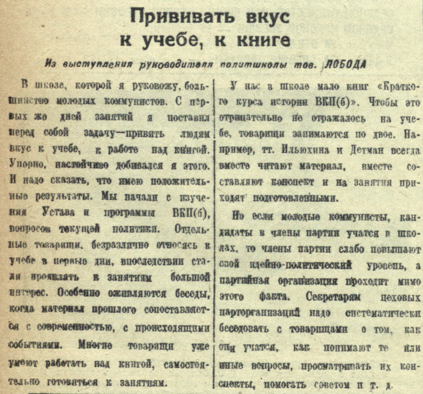 В школе, которой я руковожу, большинство молодых коммунистов. С первых же дней занятий я поставил перед собой задачу – привить людям вкус к учебе, к работе над книгой. Упорно, настойчиво добивался я этого. И надо сказать, что имею положительные результаты. Мы начали с изучения Устава и программы ВКП(б), вопросов текущей политики. Отдельные товарищи, безразлично относясь к учебе в первые дни, впоследствии стали проявлять к занятиям большой интерес. Особенно оживляются беседы, когда материал прошлого сопоставляется с современностью, с происходящими событиями. Многие товарищи уже умеют работать над книгой, самостоятельно готовиться к занятиям.