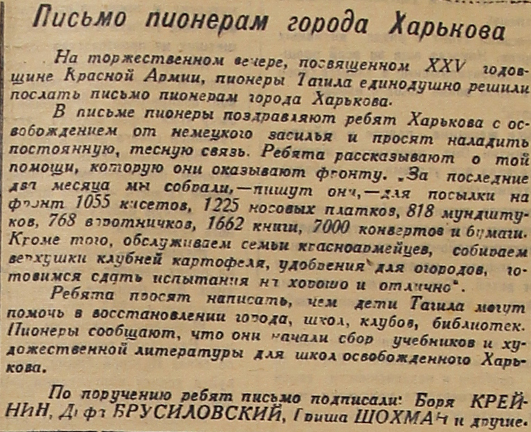 Ребята просят написать, чем дети Тагила могут помочь в восстановлении города, школ, клубов, библиотек. Пионеры сообщают, что они начали сбор учебников и художественной литературы для школ освобожденного Харькова.