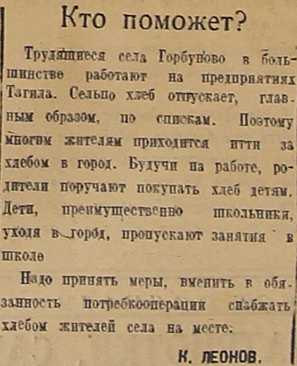 Трудящиеся села Горбуново в большинстве работают на предприятиях Тагила. Сельпо хлеб отпускает, главным образом, по спискам. Поэтому многим жителям приходится идти за хлебом в город. Будучи на работе, родители поручают покупать хлеб детям. Дети, преимущественно школьники, уходя в город, пропускают занятия в школе.