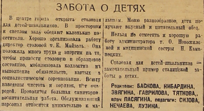 В центре города открыта столовая для детей-школьников. В просторном и светлом зале обедают маленькие посетители. Хорошо организовал работу директор столовой т. Е. Майзель. Она положила много труда и энергии на то, чтобы привести столовую в образцовое состояние, мобилизовала коллектив на выполнение обязательств, взятых в социалистическом соревновании. Всюду наведены чистота и порядок, нет очередей. Проводится большая санитарно-воспитательная работа. Обслуживающий персонал относится внимательно к малышам. Меню разнообразное, дети получают вкусный и питательный обед.