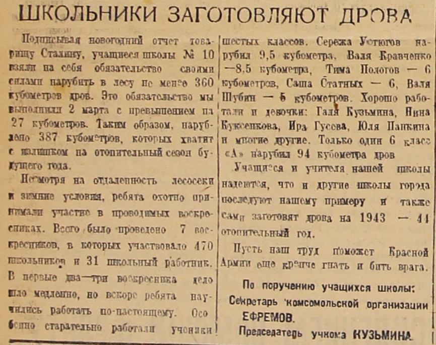 Подписывая новогодний отчет товарищу Сталину, учащиеся школы № 10 взяли на себя обязательство своими силами нарубить в лесу не менее 360 кубометров дров. Это обязательство мы выполнили 2 марта с превышением на 27 кубометров. Таким образом, нарублено 387 кубометров, которых хватит с излишком на отопительный сезон будущего года.