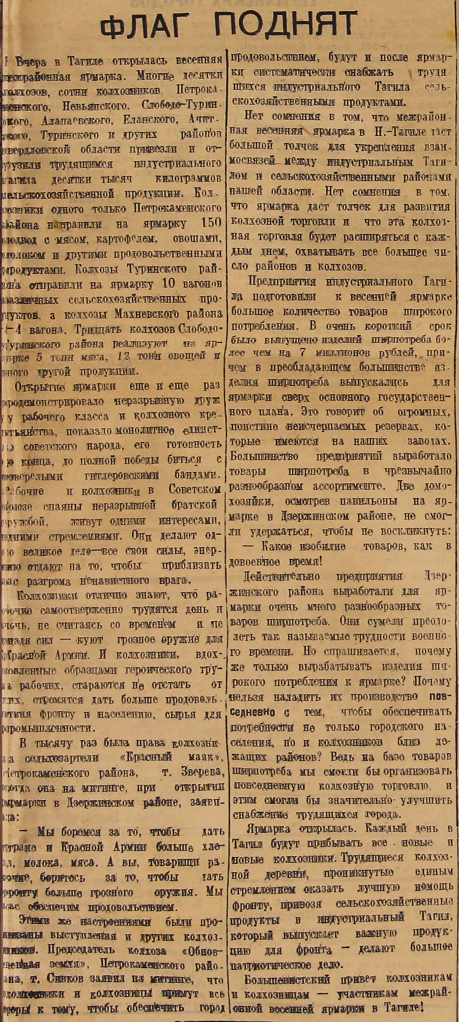 Нет сомнения в том, что межрайонная весенняя ярмарка в Н.-Тагиле даст большой толчок для укрепления взаимосвязей между индустриальным Тагилом и сельскохозяйственными районами нашей области. Нет сомнения в том, что ярмарка даст толчок для развития колхозной торговли и что эта колхозная торговля будет расширяться с каждым днем, охватывать все большее число районов и колхозов.