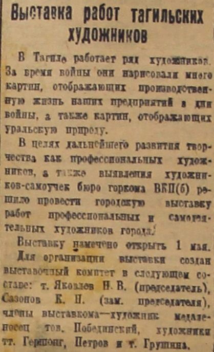 В Тагиле работает ряд художников. За время войны они нарисовали много картин, отображающих производственную жизнь наших предприятий в дни войны, а также картин, отображающих уральскую природу.