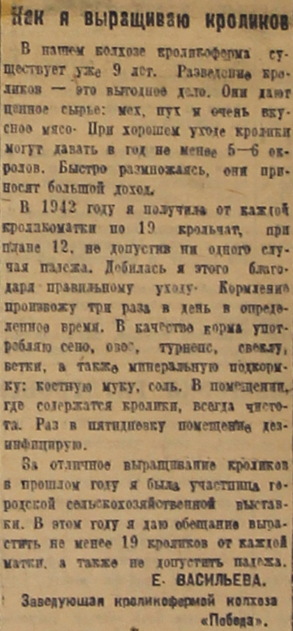 В 1942 году я получила от каждой кроликоматки по 19 крольчат, при плане 12, не достигнув ни одного случая падежа. Добилась я этого благодаря правильному уходу. Кормление произвожу три раза в день в определенное время. В качестве корма употребляю сено, овес, турнепс, свеклу, ветки, а также минеральную подкормку: костную муку, соль. В помещении, где содержатся кролики, всегда чистота. Раз в пятидневку помещение дезинфицирую.