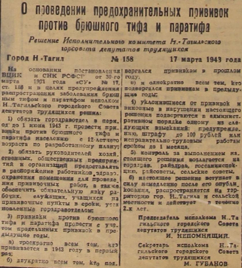 На основании постановления ВЦИК и СНК РСФСР от 30-го марта 1931 года «СУ» №17, ст.186 и в целях предупреждения распространения заболевания брюшным тифом и паратифом исполком Н.Тагильского городского Совета депутатов трудящихся решил: