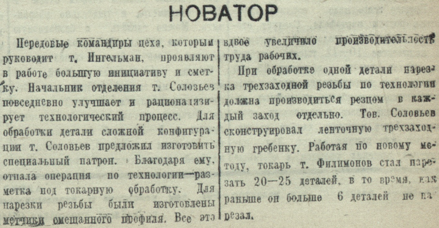 Передовые командиры цеха, которым руководит т. Ингельман, проявляют в работе большую инициативу и сметку. Начальник отделения т. Соловьев повседневно улучшает и рационализирует технологический процесс. Для обработки детали сложной конфигурации т. Соловьев предложил изготовить специальный патрон. Благодаря ему, отпала операция по технологии – разметка под токарную доработку. Для нарезки резьбы были изготовлены метчики смешанного профиля. Все это вдвое увеличило производительность труда рабочих.