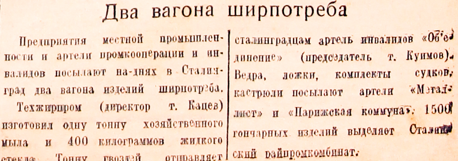 Техжирпром (директор т. Кацев) изготовил одну тонну хозяйственного мыла и 400 килограммов жидкого стекла. Тонну гвоздей отправляет сталинградцам артель инвалидов «Объединение» (председатель т. Куимов). Ведра, ложки, комплекты судков, кастрюли посылают артели «Металлист» и «Парижская коммуна». 1500 гончарных изделий выделяет Сталинский райпромкомбинат.