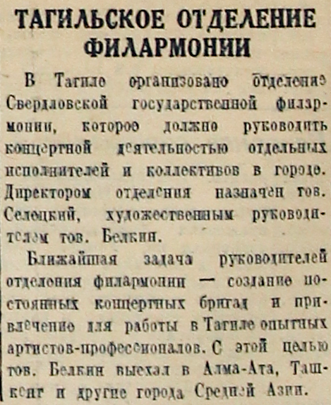В Тагиле организовано отделение Свердловской государственной филармонии, которое должно руководить концертной деятельностью отдельных исполнителей и коллективов в городе. Директором отделения назначен тов. Селецкий, художественным руководителем тов. Белкин.
