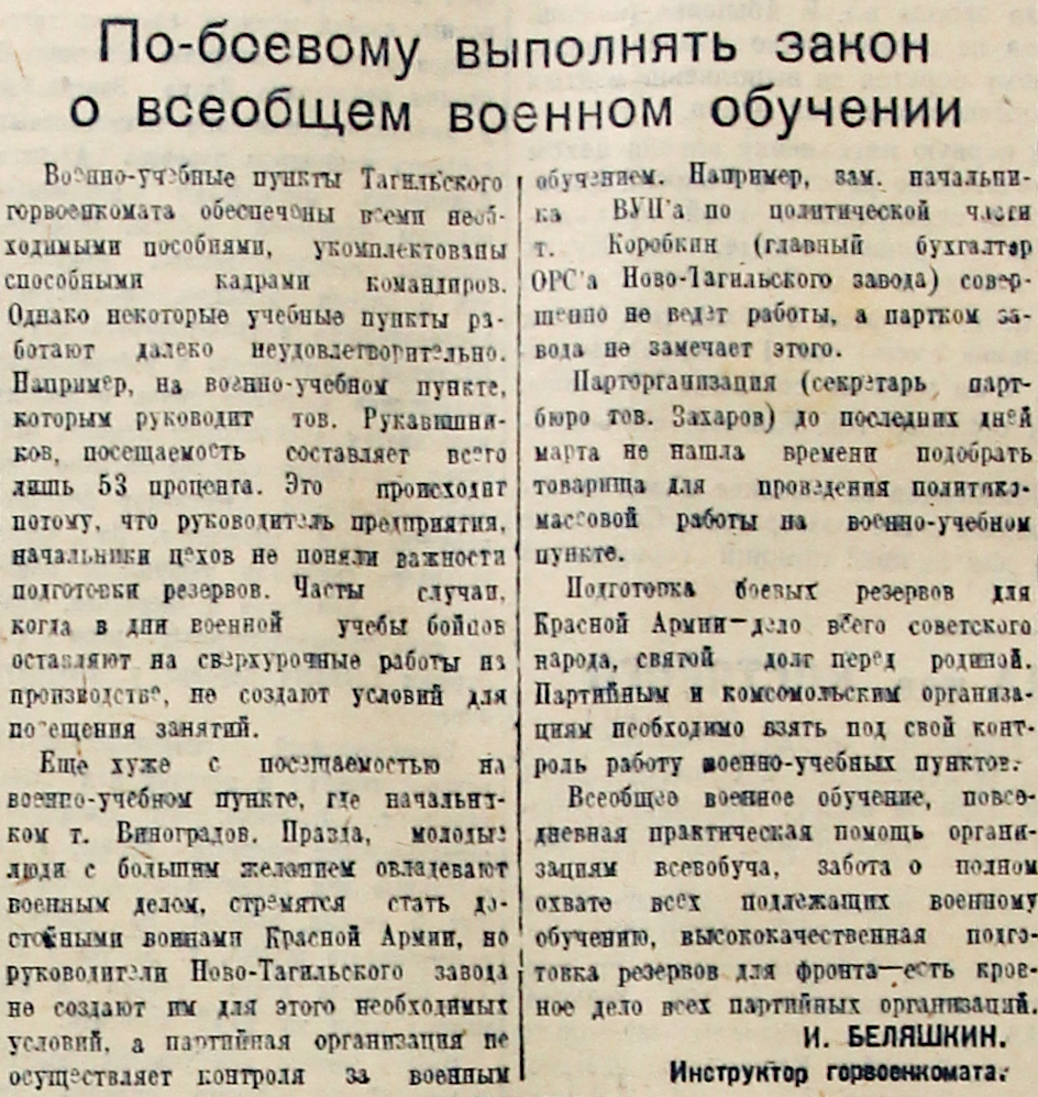 Военно-учебные пункты Тагильского горвоенкомата обеспечены всеми необходимыми пособиями, укомплектованы способными кадрами командиров. Однако некоторые учебные пункты работают далеко неудовлетворительно. Например, на военно-учебном пункте, которым руководит тов. Рукавишников, посещаемость составляет всего лишь 53 процента. Это происходит потому, что руководитель предприятия, начальники цехов не поняли важности подготовки резервов. Часты случаи, когда в дни военной учебы бойцов оставляют на сверхурочные работы на производстве, не создают условий для посещения занятий.