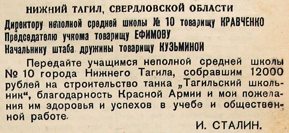 Передайте учащимся неполной средней школы № 10 города Нижнего Тагила, собравшим 12000 рублей на строительство танка «Тагильский школьник», благодарность Красной Армии и мои пожелания им здоровья и успехов в учебе и общественной работе.