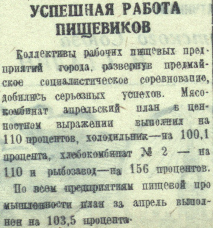 Коллективы рабочих пищевых предприятий города, развернув предмайское соревнование, добились серьезных успехов. Мясокомбинат апрельский план в ценностном выражении выполнил на 110 процентов, холодильник – на 100,1 процента, хлебокомбинат № 2 – на 110 и рыбозавод – на 156 процентов.