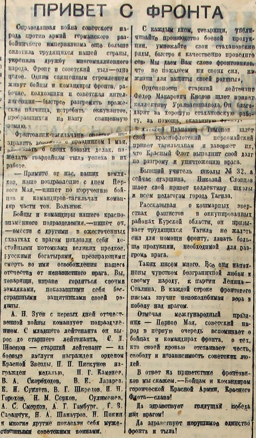 Фронтовики-тагильчане спешат поздравить земляков с праздником 1 мая, – пишет по поручению бойцов и командиров части тов. Вольнюк.