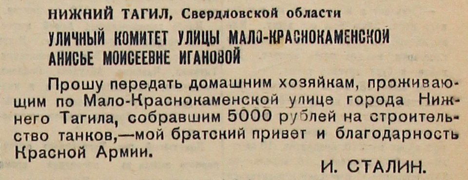 Прошу передать домашним хозяйкам, проживающим по Мало-Краснокаменской улице города Нижнего Тагила, собравшим 5000 рублей на строительство танков, – мой братский привет и благодарность Красной Армии.