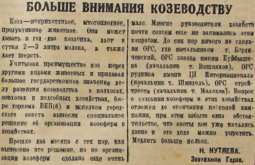 Прошло два месяца с тех пор, как вынесено это решение, но по организации козеферм сделано еще очень мало. Многие руководители хозяйств почти совсем еще не занимались этим вопросом. До сих пор ничего не сделали ОРС, где начальником т. Бердичевский, ОРС завода имени Куйбышева (начальник т. Вишняков), ОРС рудника имени III Интернационала (начальник т. Шиндель), ОРС стройтреста (начальник т. Малахов). Вопрос о создании козеферм в этих хозяйствах отложен до окончания посевной кампании, при этом забыто одно обстоятельство, что окоты коз уже начались давно и это дело можно упустить. Медлить больше нельзя.