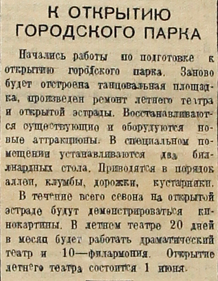 Начались работы по подготовке к открытию городского парка. Заново будет отстроена танцевальная площадка, произведен ремонт летнего театра и открытой эстрады. Восстанавливаются существующие и оборудуются новые аттракционы. В специальном помещении устанавливаются два биллиардных стола. Приводятся в порядок аллеи, клумбы, дорожки, кустарники.