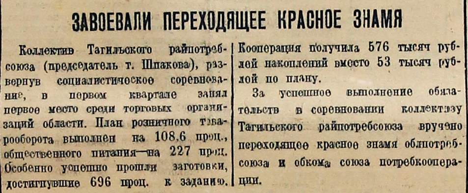 Коллектив Тагильского райпотребсоюза (председатель т. Шпакова), развернув социалистическое соревнование, в первом квартале занял первое место среди торговых организаций области. План розничного товарооборота выполнен на 108,6 проц., общественного питания – на 227 проц. Особенно успешно прошли заготовки, достигнувшие 696 проц. к заданию. Кооперация получила 676 тысяч рублей накоплений вместо 53 тысяч рублей по плану.