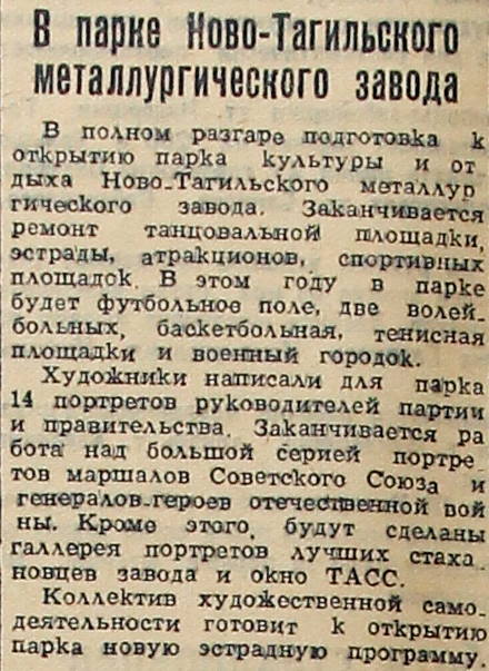 В полном разгаре подготовка к открытию парка культуры и отдыха Ново-Тагильского металлургического завода. Заканчивается ремонт танцевальной площадки, эстрады, атракционов, спортивных площадок. В этом году в парке будет футбольное поле, две волейбольных, баскетбольная, тенисная площадки и военный городок.