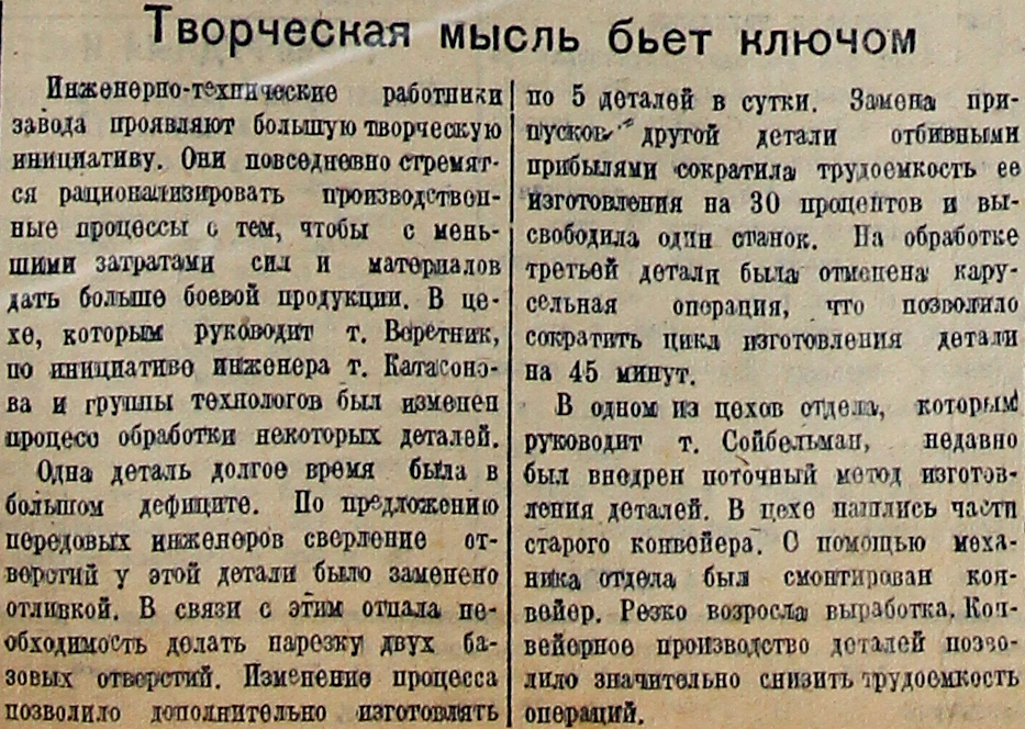 Инженерно-технические работники завода проявляют большую творческую инициативу. Они повседневно стремятся рационализировать производственные процессы с тем, чтобы с меньшими затратами cил и материалов дать больше боевой продукции. В цехе, которым руководят т. Веретник, по инициативе инженера т. Катасонова и группы технологов был изменен процесс обработки некоторых деталей.