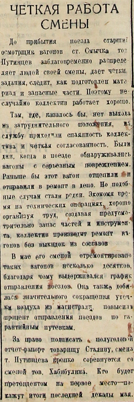 За право подписать полугодовой отчет-рапорт товарищу Сталину, смена т. Путинцева крепко соревнуется со сменой тов. Хабибулина. Кто будет претендентом на первое место – покажут итоги последней декады мая.