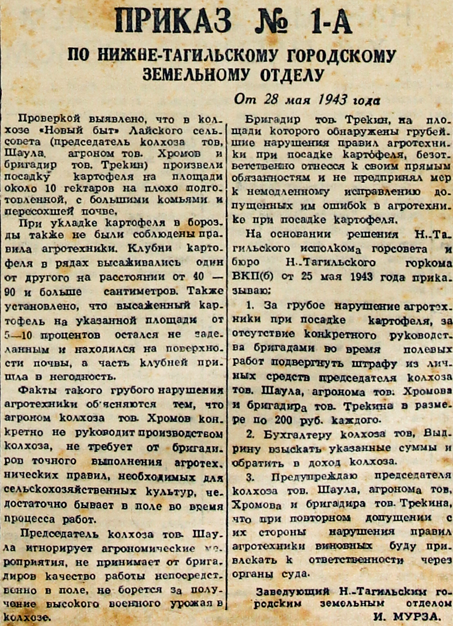 На основании решения Н.-Тагильского исполкома горсовета и бюро Н.-Тагильского горкома ВКП(б) от 25 мая 1943 года приказываю: