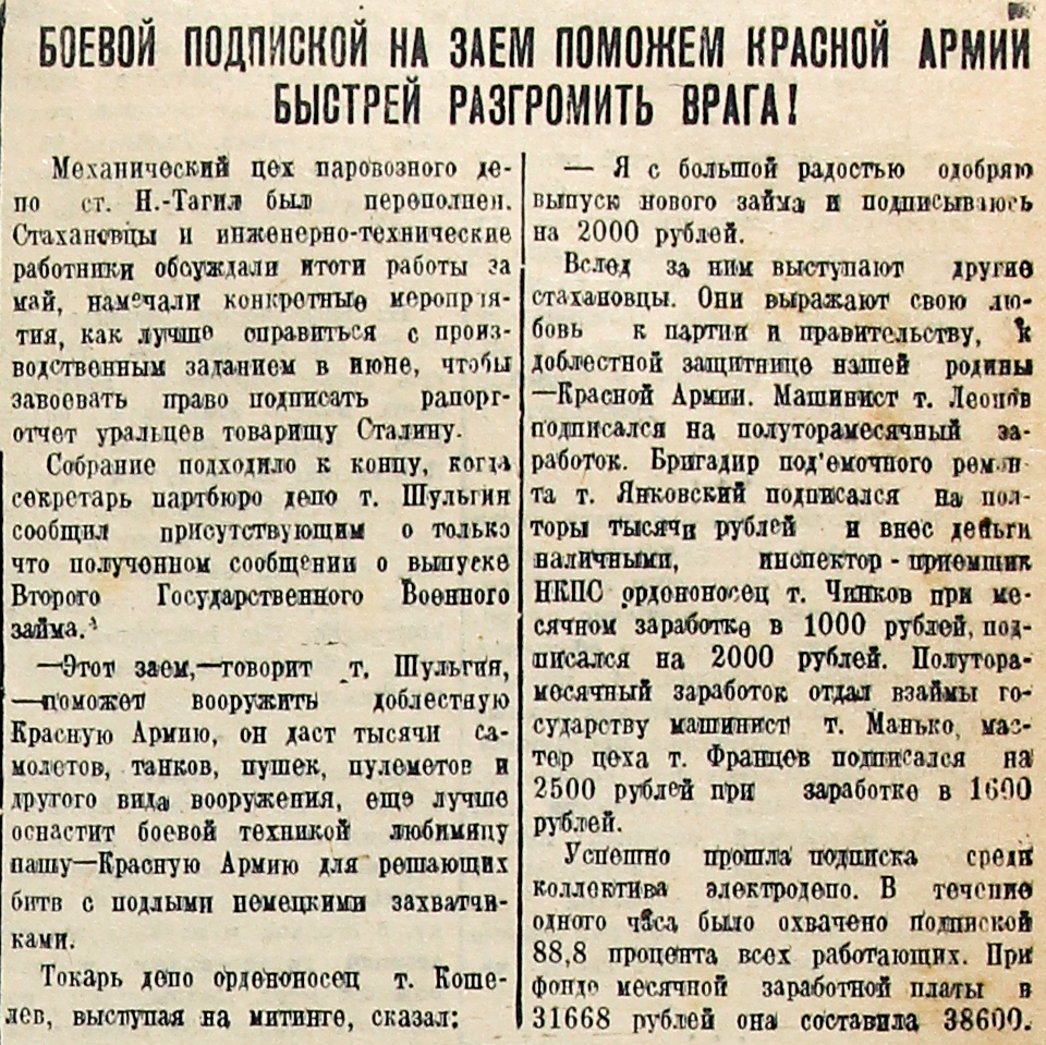 Вслед за ним выступают другие стахановцы. Они выражают свою любовь к партии и правительству, к доблестной защитнице нашей родины – Красной Армии. Машинист т. Леонов подписался на полуторамесячный заработок. Бригадир подъемочного ремонта т. Янковский подписался на полторы тысячи рублей и внес деньги наличными, инспектор-приемщик НКПС орденоносец т. Чинков при месячном заработке в 1000 рублей, подписался на 2000 рублей. Полуторамесячный заработок отдал взаймы государству машинист т. Манько, мастер цеха т. Францев подписался на 2500 рублей при заработке в 1600 рублей.