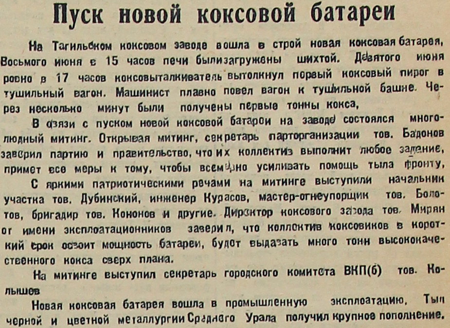 В связи с пуском новой коксовой батареи на заводе состоялся многолюдный митинг, секретарь парторганизации тов. Бадонов заверил партию и правительство, что их коллектив выполнит любое задание, примет все меры к тому, чтобы всемерно усиливать помощь тыла фронту.