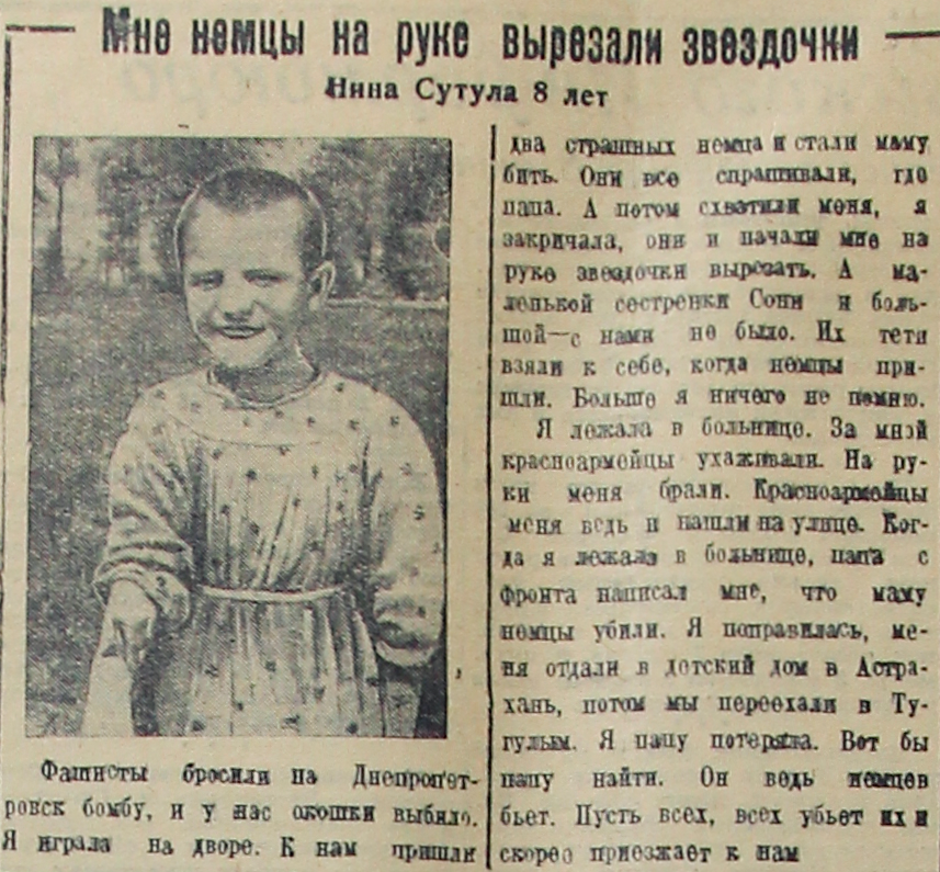 Я лежала в больнице. За мной красноармейцы ухаживали. На руки меня брали. Красноармейцы меня ведь и нашли на улице. Когда я лежала в больнице, папа с фронта написал мне, что маму немцы убили. Я поправилась, меня отдали в детский дом в Астрахань, потом мы переехали в Тугулым. Я папу потеряла. Вот бы папу найти. Он ведь немцев бьет. Пусть всех, всех убьет их и скорее приезжает к нам.